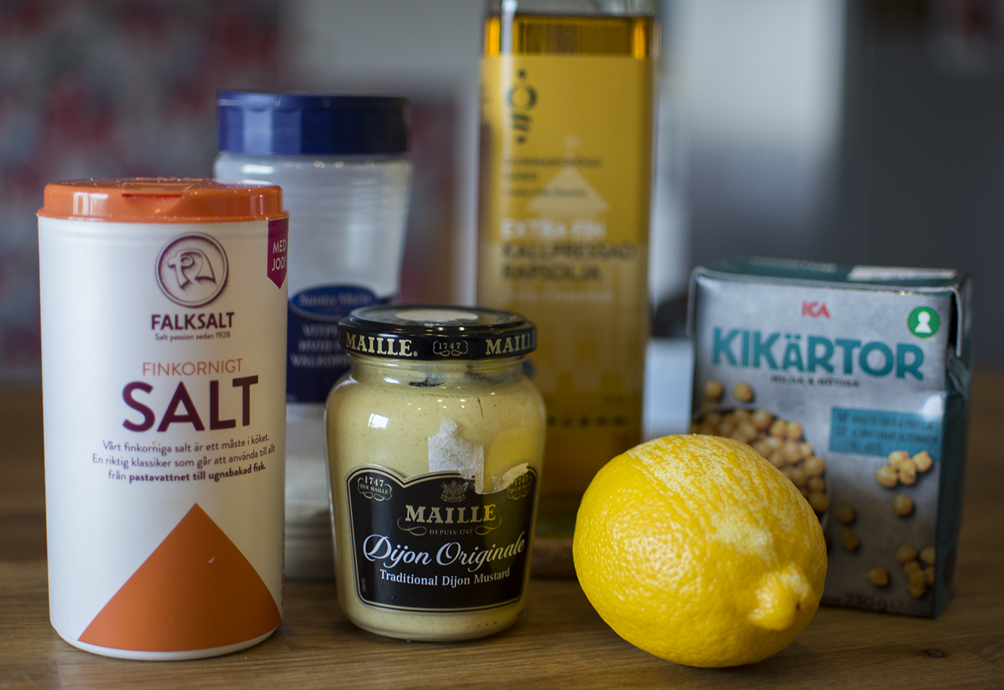 Blanda kikärtsspad och senap i en hög, smal bunke och pressa i citronsaften. Häll ner rapsolja i en tunn stråle samtidigt som du mixar med en stavmixer på högsta fart. Mixa tills konsistensen är krämig (var beredd på att det tar en stund). Smaka av med salt och peppar. Mixa igen och fortsätt till majonnäsen är riktigt tjock.