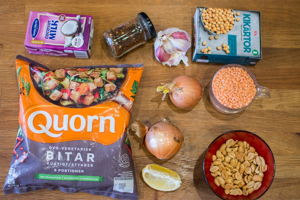 Mixa jordnötterna och häll ner i grytan, tillsammans med bjäst, quornbitar (direkt från frysen funkar bra) och kokosmjölk. Rör om och koka i ungefär 12 minuter. Häll i lite mer vatten om konsistensen är för tjock.