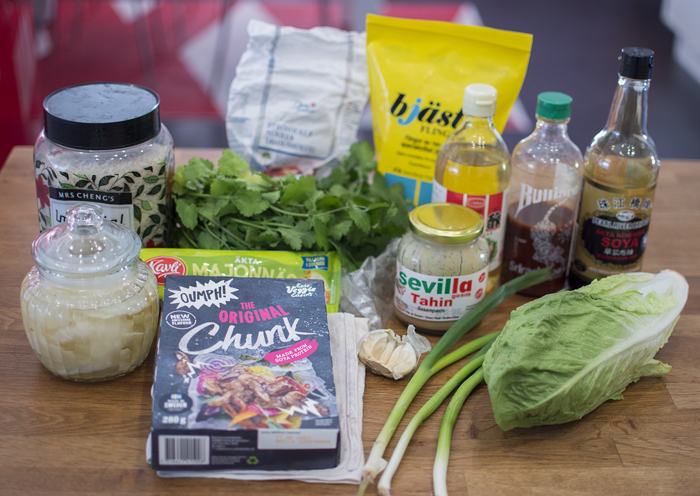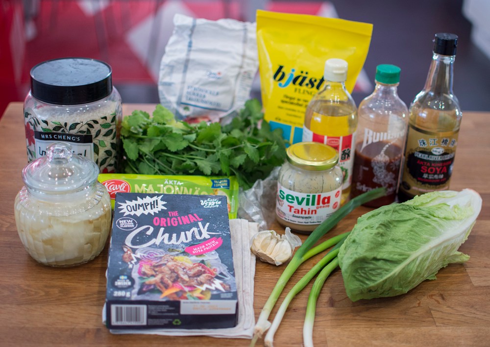 Fördela riset på fyra tallrikar. Placera ut salladsbladen och fyll dem med oumph. Toppa med picklad rotselleri och vårlök. Ringla chiliaioli över. (Toppa med koriander.)
