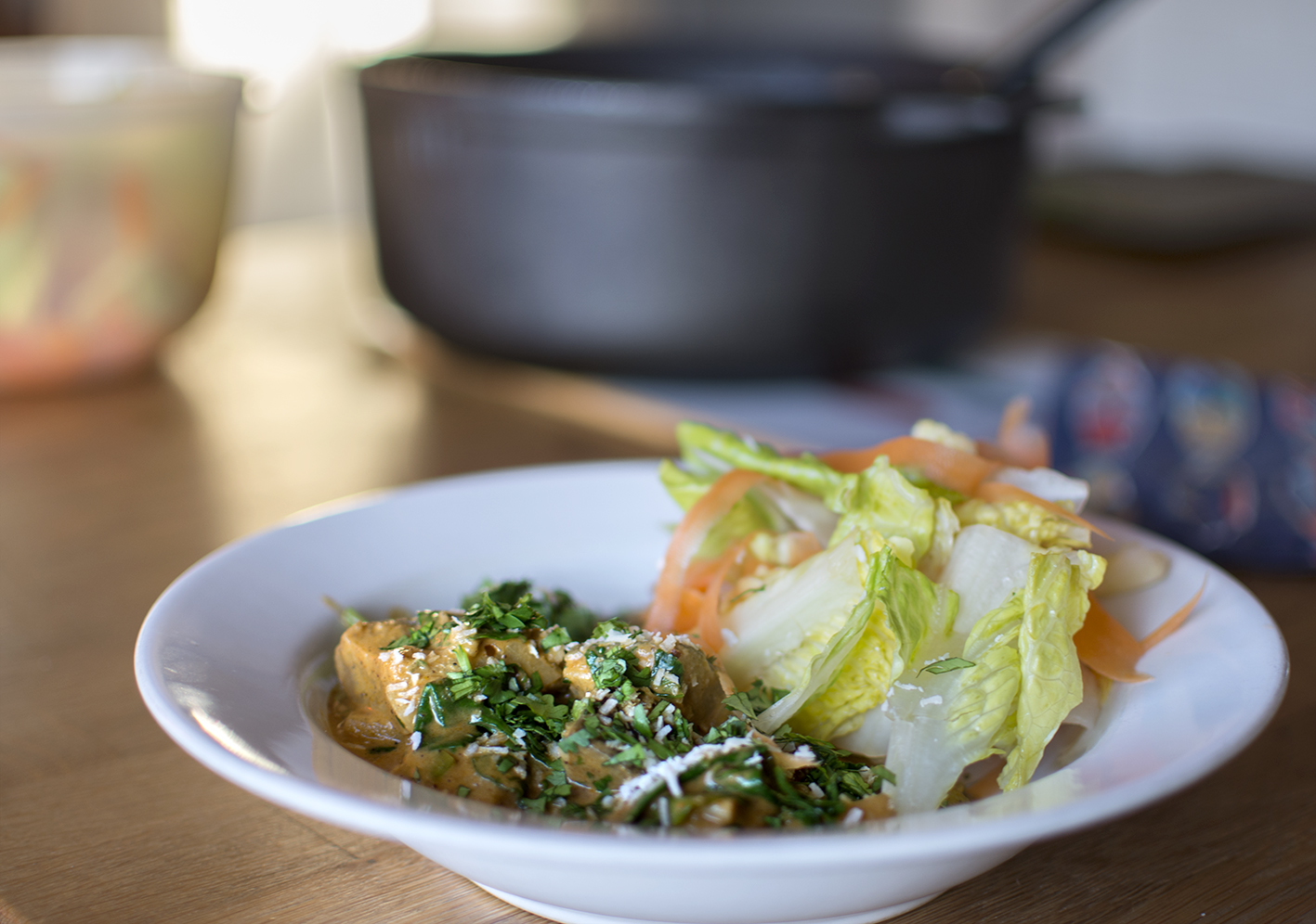 Skölj, torka av och hacka koriandern. Häll i det mesta, tre fjärdedelar, i grytan tillsammans med och hälften av kokosflingorna. Rör om, smaka av och krydda mer vid behov.
