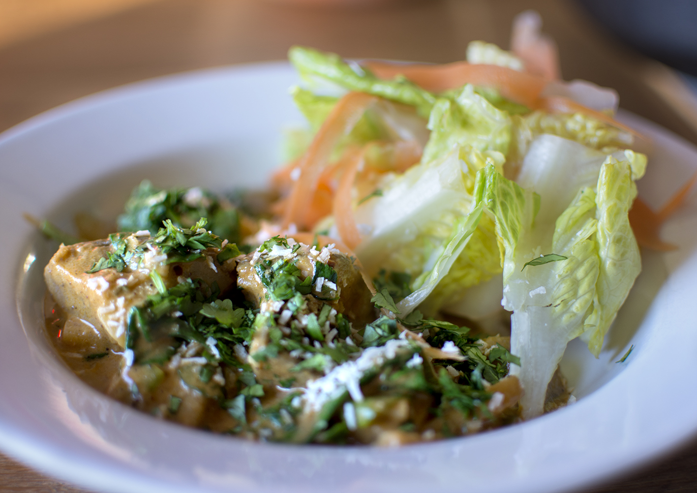 Fördela grytan på fyra tallrikar. Sprinkla över resten av koriandern och kokosflingorna.