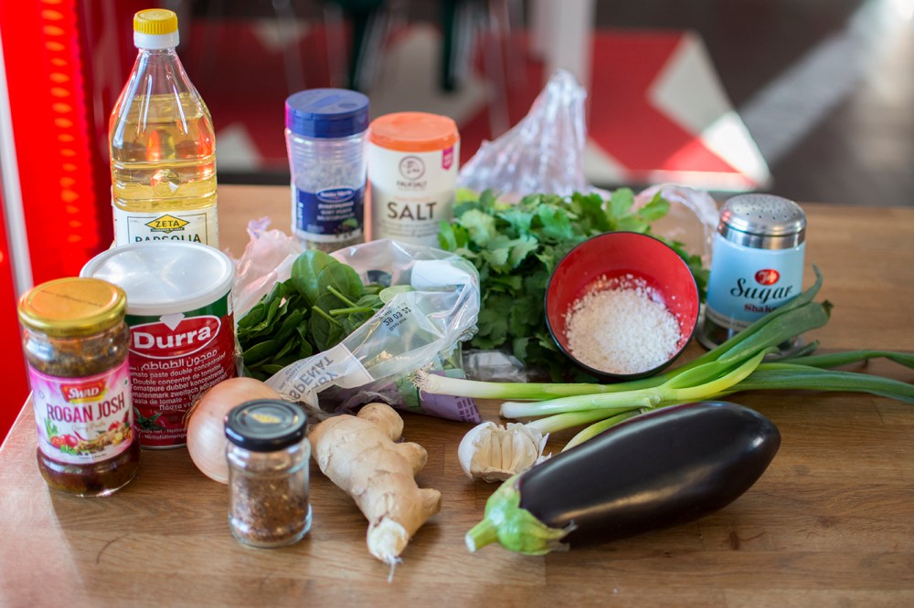 Hetta upp olja i en gjutjärnsgryta och fräs tomatpurén i ett par minuter. Tillsätt auberginen och stek tills den fått fin yta. Häll i lök, vitlök, vårlök och ingefära. Fräs ett par minuter till och tillsätt sedan 2 deciliter vatten. Låt koka upp.