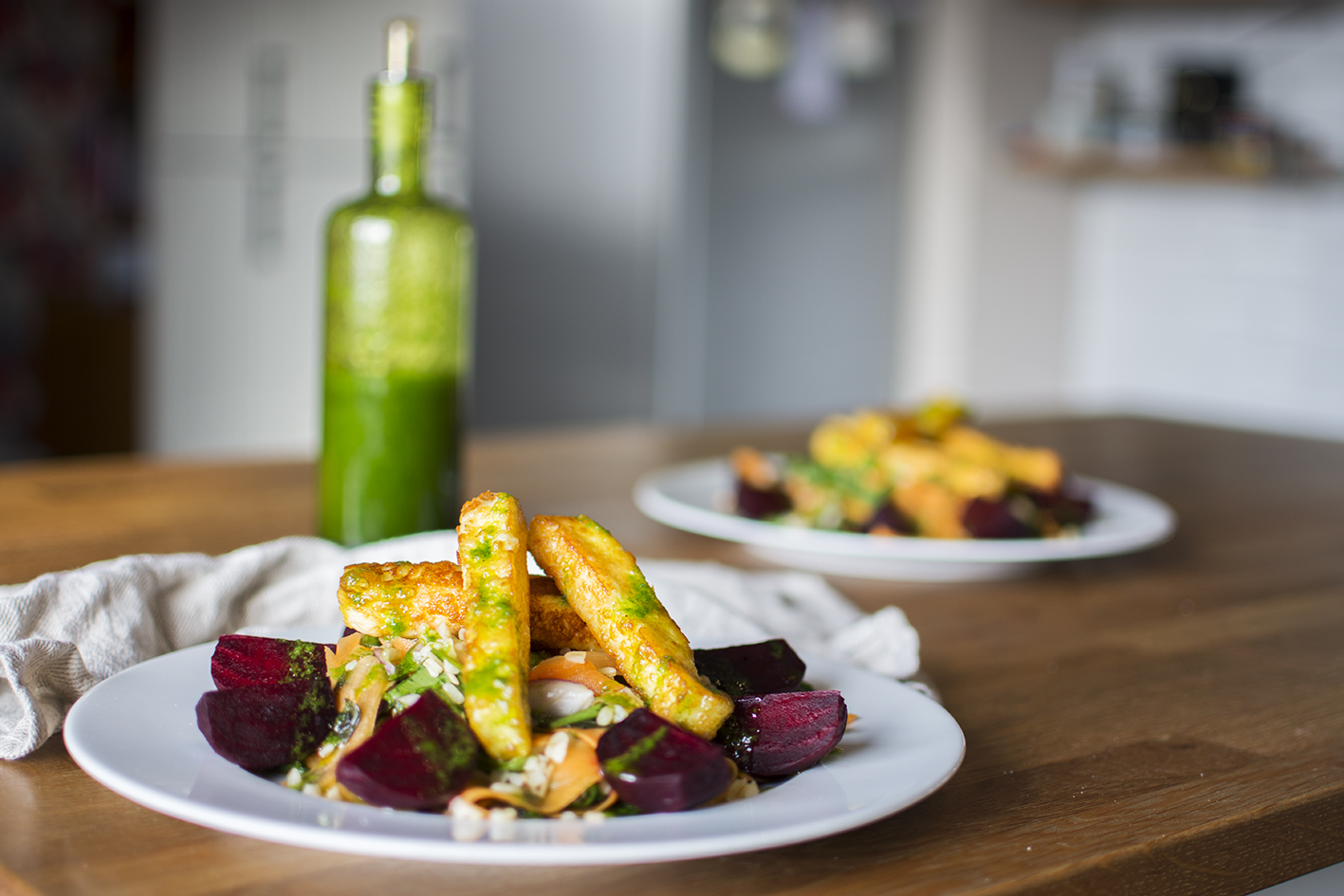 Fördela ramslökssallad på fyra tallrikar och placera ut rödbetskvartar runt om. Lägg den friterade osten på toppen och ringla ramslöksolja över hela anrättningen. Njut!