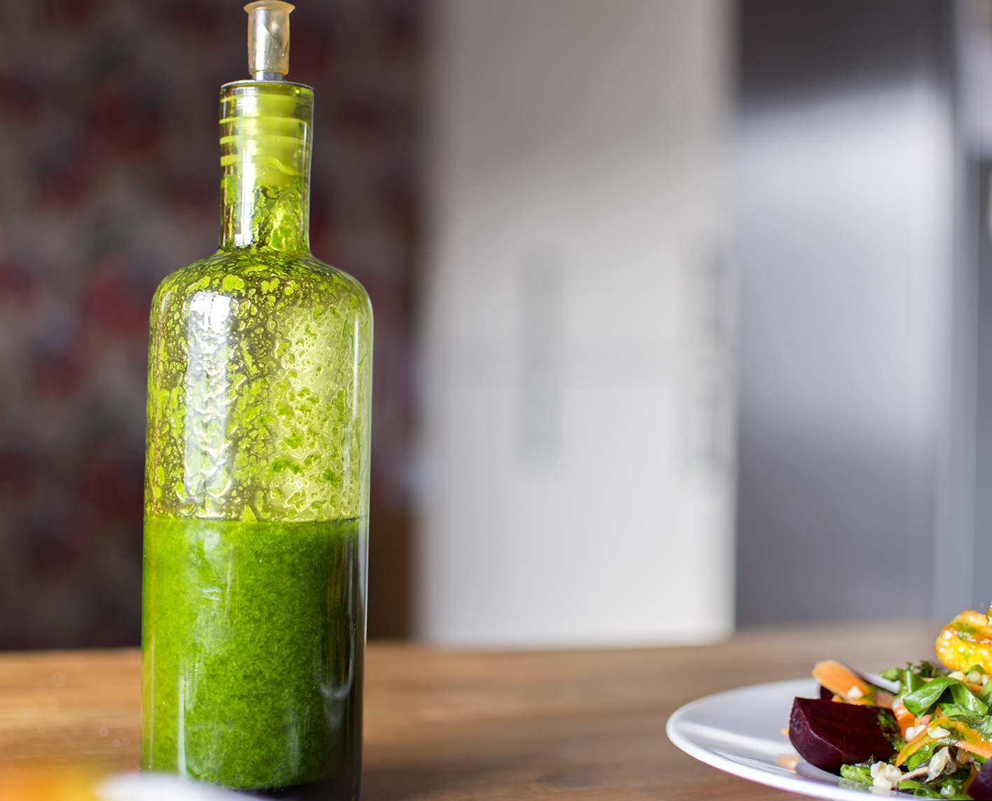 Börja med oljan. Grovhacka ramslöksbladen och mixa med olivolja och salt. Smaka av. Låt stå.