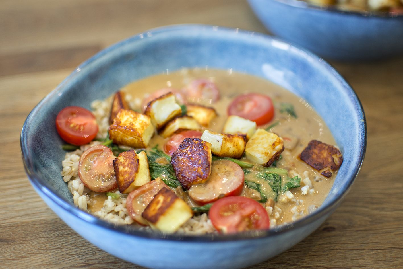 Stek grillosten i olja tills den blir gyllene. Lägg åt sidan och sänk värmen på plattan. Häll jordnötssås, kokosmjölk, vindalookrydda och babyspenat i stekpannan. Sjud i två minuter. Häll i nästan alla tomathalvor och rör om.
