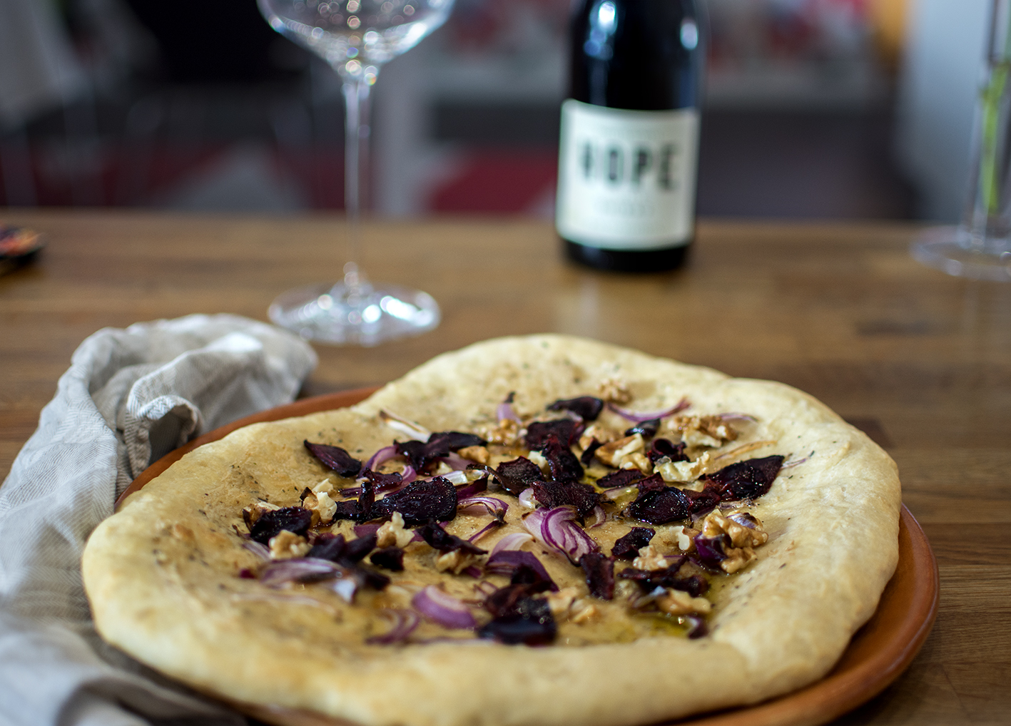 Ta ut pizzorna när de fått gyllene färg. Toppa med rödbetor och valnötter. Ringla över lönnsirap och liter mer olivolja.