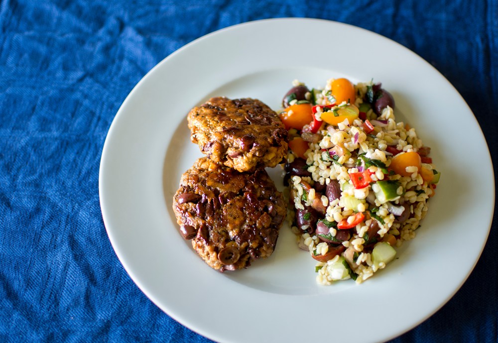 Augusti närmar sig sitt slut och därför tänkte jag att det passar fint med en enkel vegansk rätt med diverse ingredienser från både trädgårdens skörd och sådant som bör rensas ut från kylskåpet. Det blev vegobiffar på Anammas formbara färs (av ärta) som jag smaksatte med oliver. Till det en somrig blandsallad. (Och i nästa vecka blir det mer mat på temat skördetid – håll ut.)