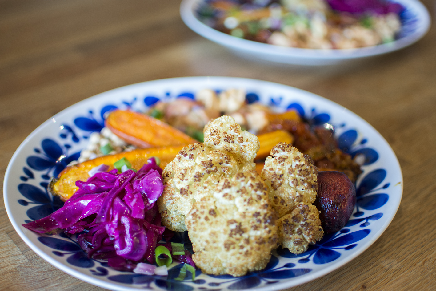 För några veckor sedan skrev jag om ett gotländskt matminne från sommarens semesterresa. Nu är det dags igen! Den här gången ville jag laga något inspirerat av en väldigt god lunch på Krusmyntagården, en dryg mils platt cykling från Visby. Jag fick ett fat med utsökt rostad blomkål, bakade morötter, krispiga frön … Åh!