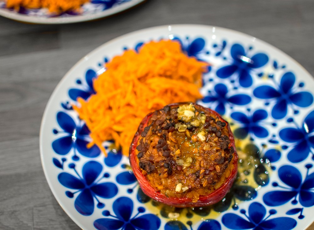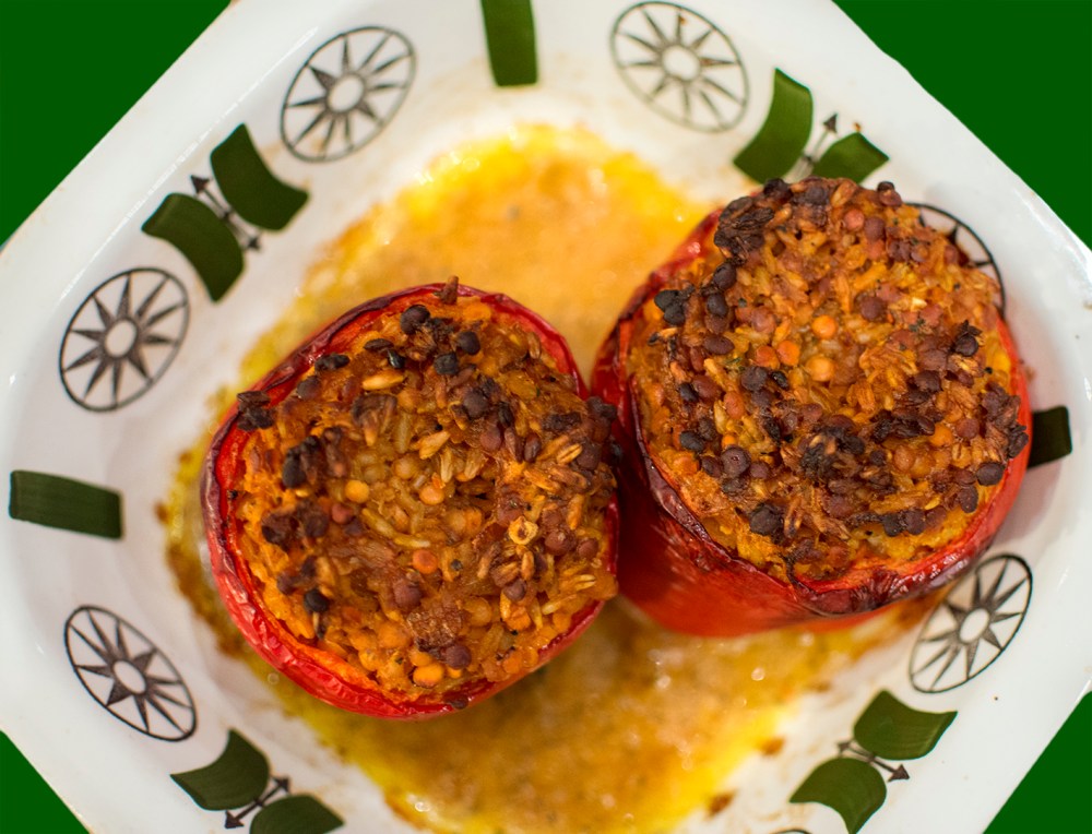 Ännu en rätt som är ful men underbart god! Den här varianten av fylld paprika var verkligen en fullträff. Fixade vegofärs av röda linser för att slippa halvfabrikaten. Sen var det bara att krydda med massor av värmande smaker; spiskummin, cayenne, rökt paprika … och vänta medan doften från ugnen blev nästan oemotståndlig. Lite att fixa med, men så värt jobbet.