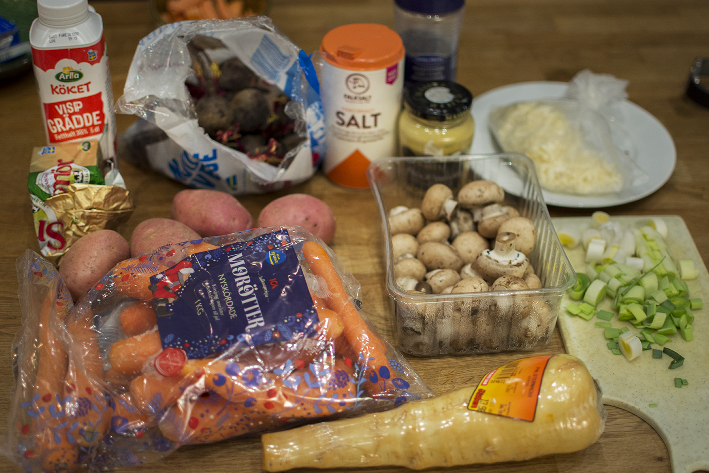 Då var vi inne i december, igen. Den aktualitetskroken har egentligen inget med veckans maträtt att göra, en härlig gratäng med svamp och rotfrukter. Vi åt den till middag utan andra tillbehör än en krispig broccoli. Men den passar nog fint in som komplement på ett grönt julbord också.