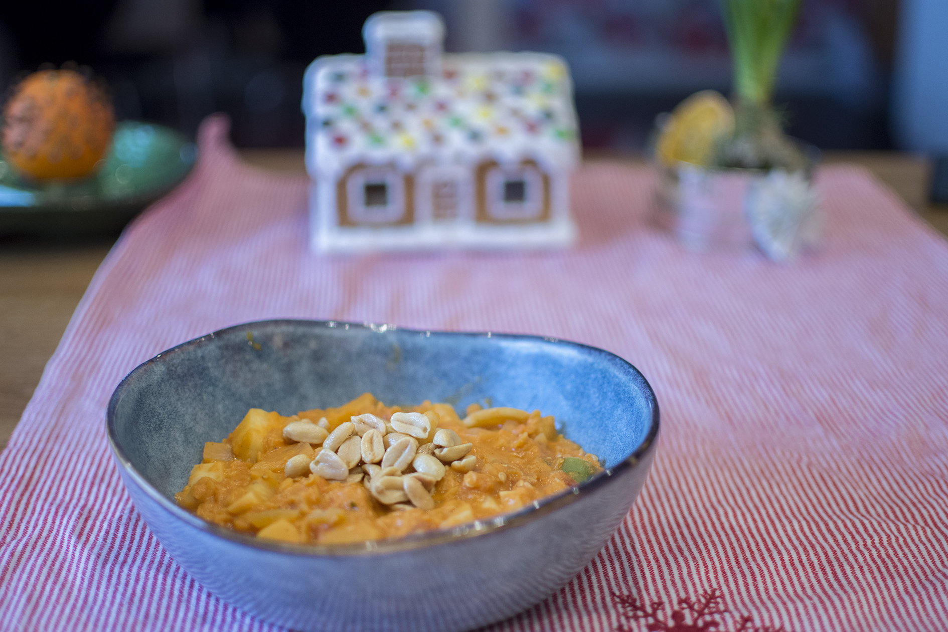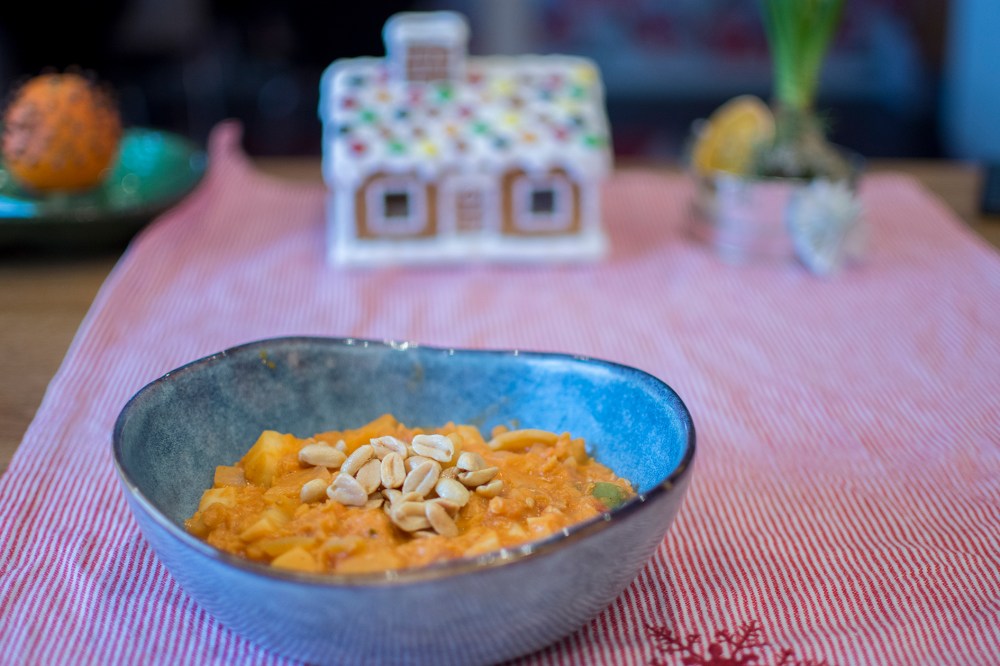 Jag gör ingen särskild julmat i år, men den här smakrika linsgrytan fick åtminstone en liten touch av juliga kryddor. Men mest smakar den jordnöt! En billig, lättlagad och värmande gryta att njuta av i vintermörkret.