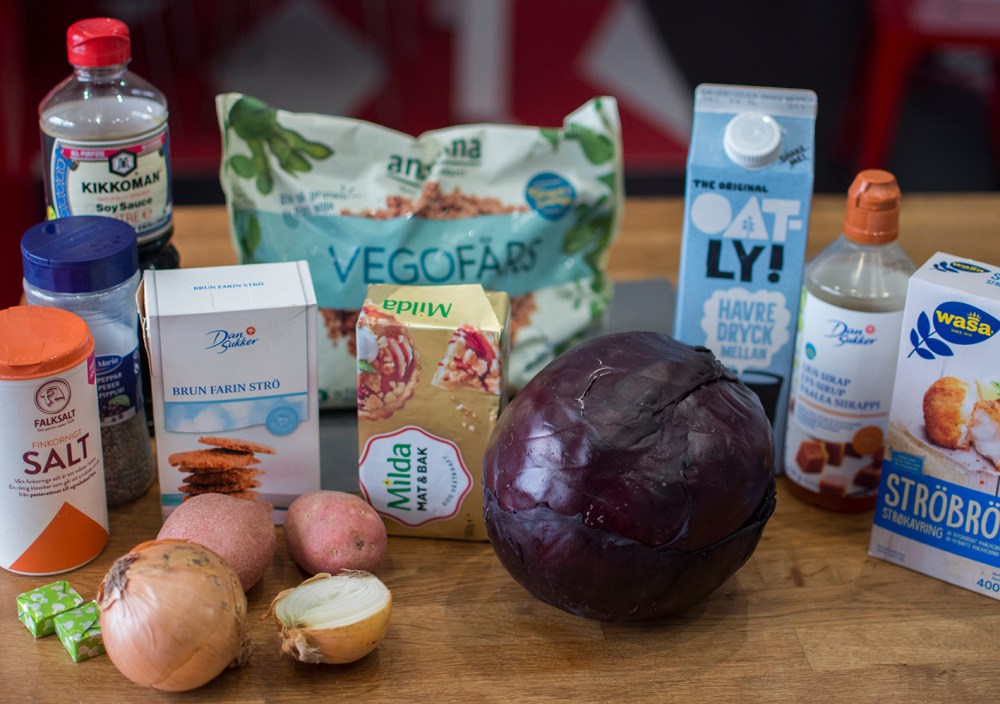 Blanda ströbröd och havremjölk. Låt svälla. Mosa ned den kokta potatisen. Blanda ströbrödsröran med kål och lök. Lägg hälften av blandningen i botten av en stor ugnsform, fördela vegofärsröran över och toppa med resten av kålen. Pudra över farinsocker och klicka margarinet på ytan.