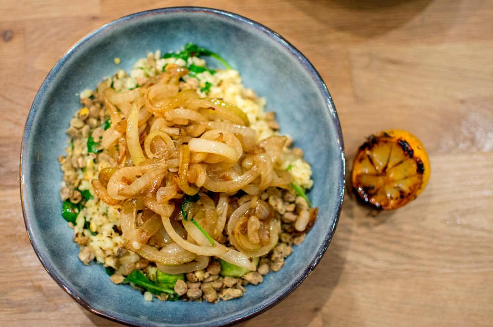 Blanda bulgur med brysselkål och babyspenat. Fördela på tallrikar och toppa med de gröna linserna och löken. Pressa över den stekta citronen.