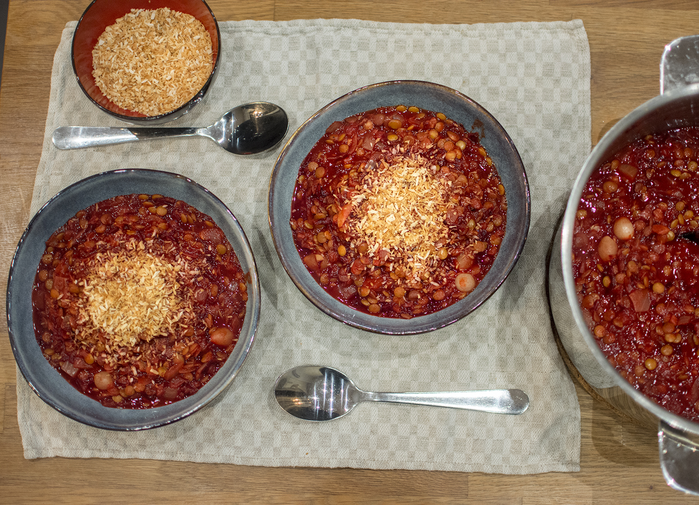 Jag gör ofta olika slags linsgrytor, men använder sällan gröna linser. Nu var det dags! De är ju faktiskt lite mer matiga och ger större tuggmotstånd än röda, så det passade fint i den här rustika vintergrytan, som fick en härligt djupt röd färg av rödbeta.