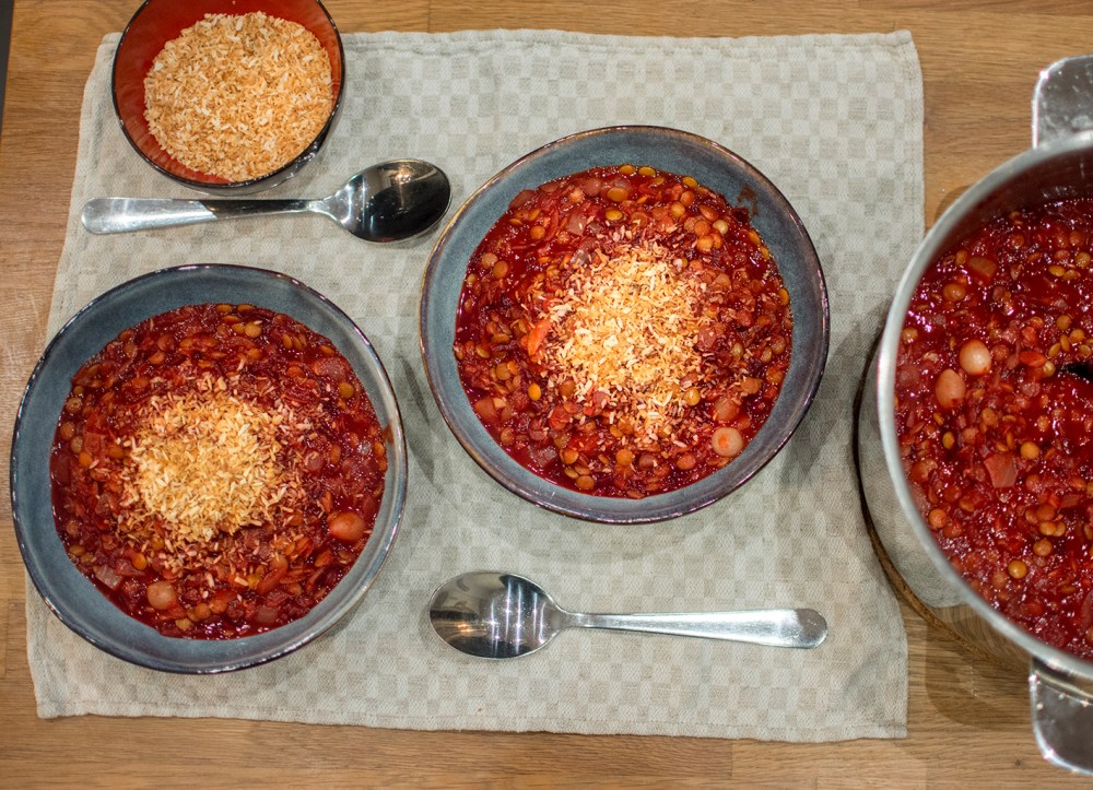 Rör om och fördela i djupa tallrikar. Toppa med rostad kokos.