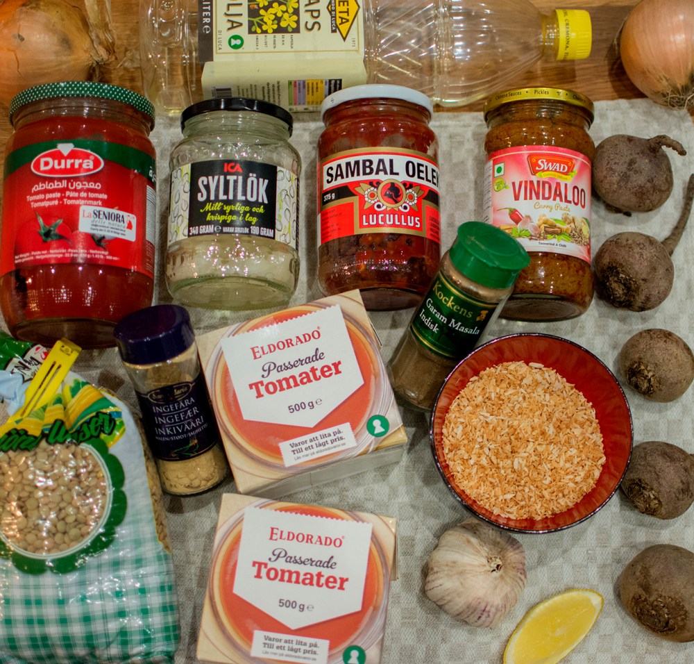Tillsätt tomatpuré och fräs i en minut. Pytsa i linserna, sambal oelek, vindaloo, ingefära, garam masala, passerade tomater och grönsaksbuljongtärning. Koka upp, rör om. Tillsätt vatten och låt sedan koka i cirka 15–20 minuter, tills linserna mjuknat. Späd med mer vatten om grytan är för tjock i konsistensen.