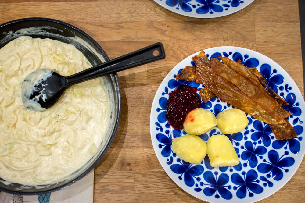 Fördela fejkon, kokt potatis och löksås på fyra tallrikar. Servera med rårörda lingon.