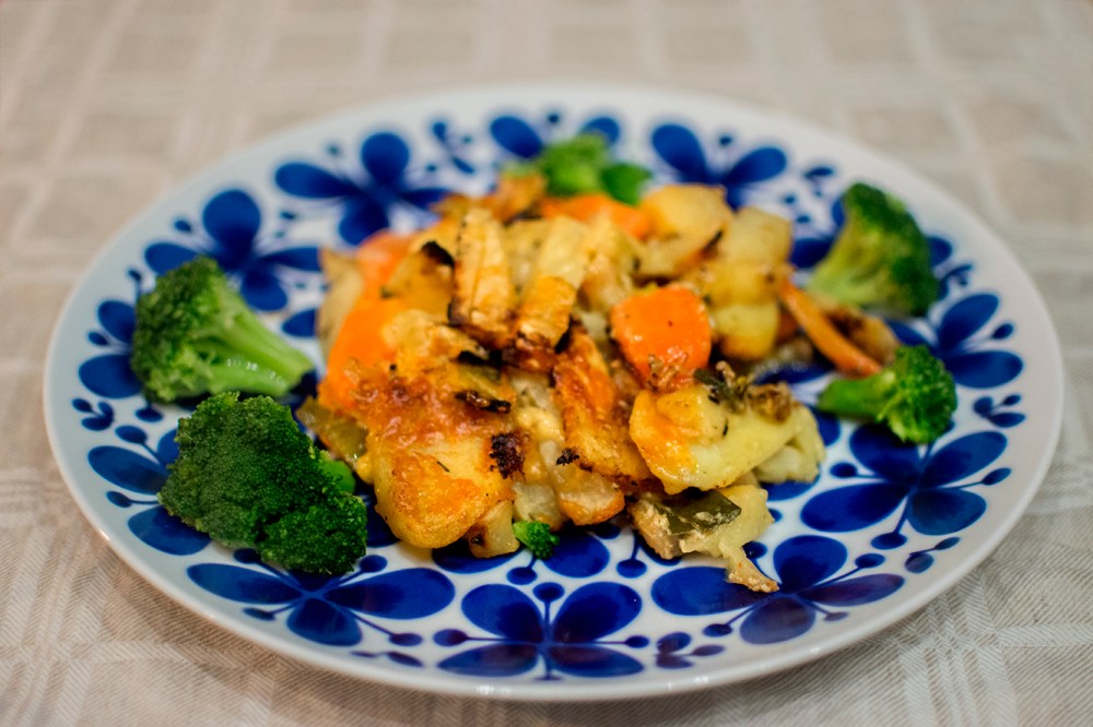 Resan blir först i maj, så under tiden får jag helt enkelt fixa käket själv. Varför inte en rotfruktsgratäng? Den tar tid men är så värd att vänta på. Jag la till rosmarin och citronzest och tänker att det är skäl nog att kalla den ”fransk”.