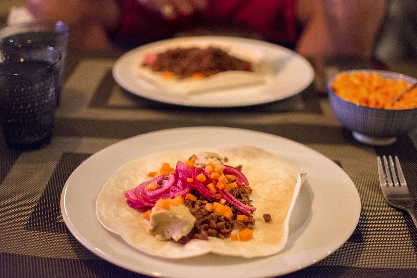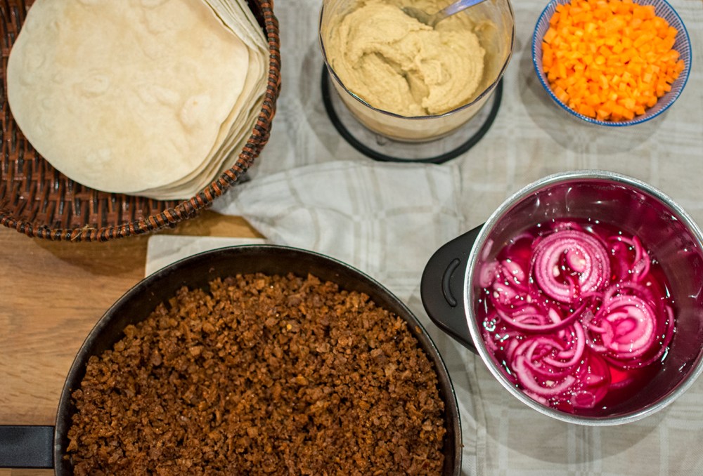 Lägg upp picklad rödlök, hummus och morotskuber i skålar. Servera färsen ur pannan och låt alla fylla tortillabröden till smakrika wraps – det blir en stunds pyssel och mat samtidigt.