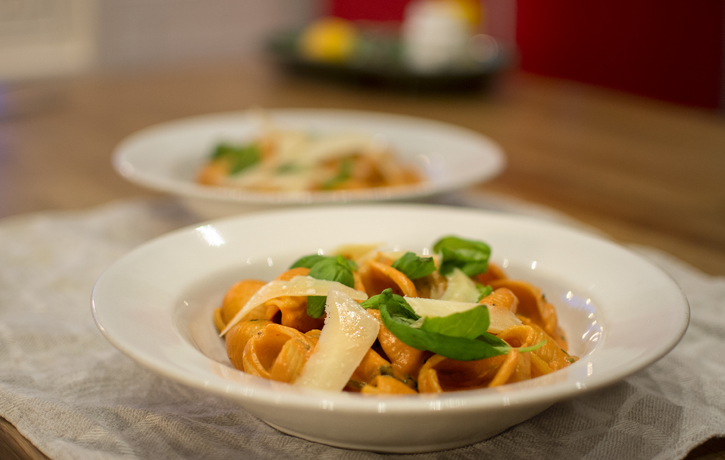 Fördela pasta och sås i tallrikar och toppa med basilikablad och hyvlad parmesan.