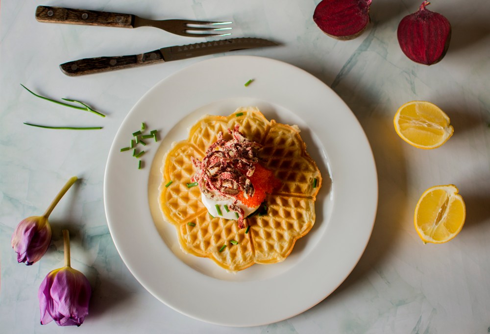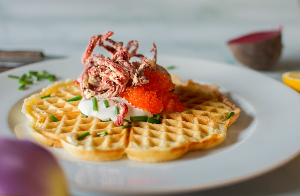 Toppa våfflorna med crème fraiche, tångcaviar och rödbetscrips. Strössla över finklippt gräslök och pressa på lite citronsaft. Klart!