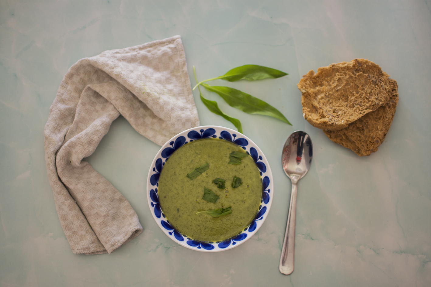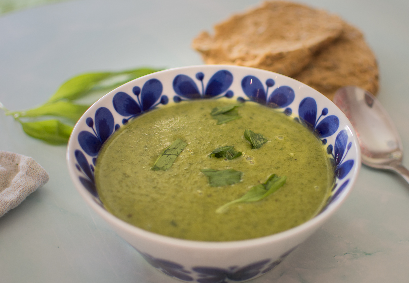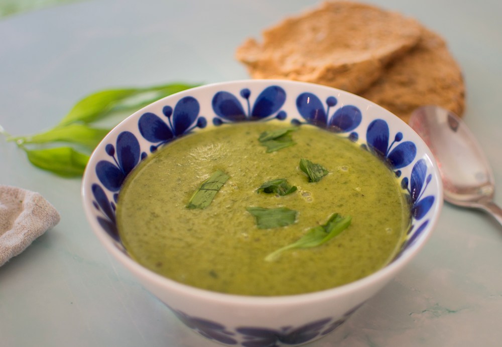 Finstrimla ramslöksbladen (lägg undan några till garnering). Tillsätt dem när soppan nästan kokat klart och sjud i några minuter till.