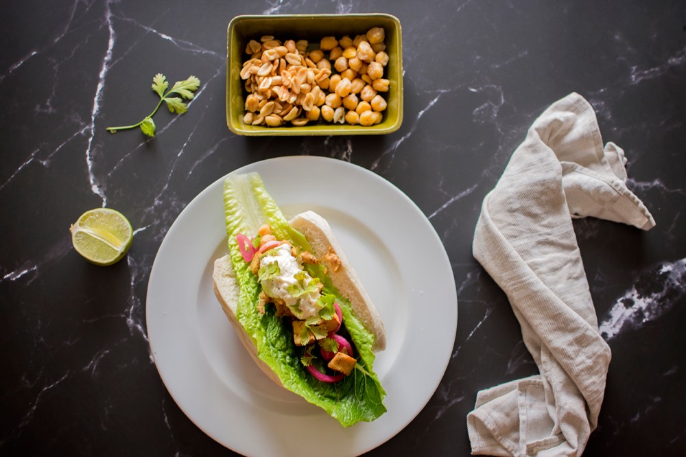 Skölj och torka romansalladsbladen. Skär en skåra i bröden och tryck ner salladen så att de bildar en bas för resten av innehållet. Fördela picklad rödlök, rostade kikärtor, tofu och jordnötter i mackorna. Ringla jordnötssås över och klicka på karamelliserad lökkräm. Toppa med korianderblad.