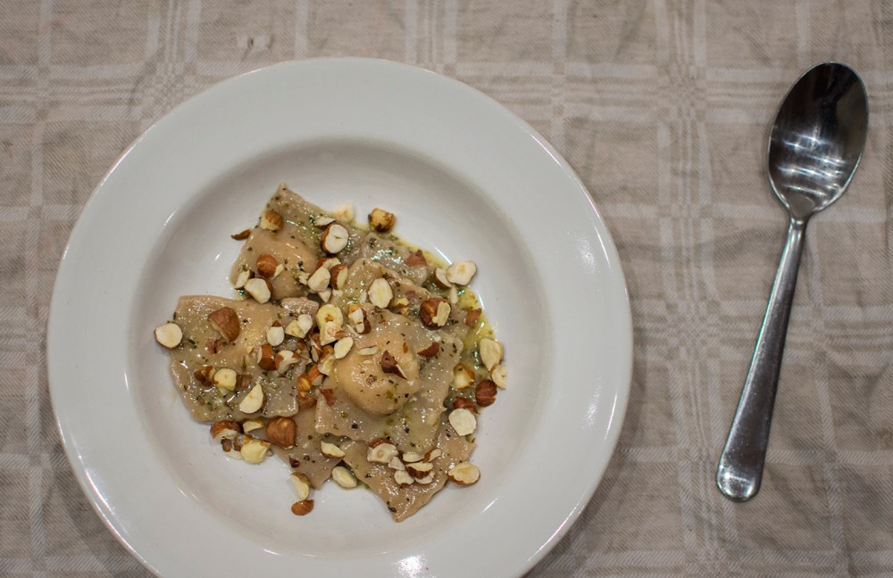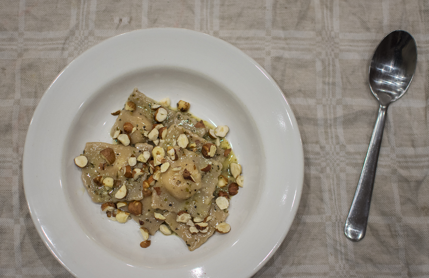 Skär ut åtta centimeter breda remsor och spritsa ut cirka en tesked fyllning med fyra centimeters mellanrum. Fukta kanterna och vik över pastan från långsidan så att du täcker fyllningen. Tryck ut luftbubblorna och skär ut raviolis med en degsporre.