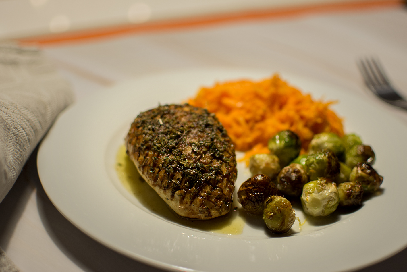 Jag passade på att baka brysselkål i ugnen när den ändå var varm och rörde ihop lite senapsdressing med rivna morötter, och voila hade jag ”franska morötter”. Det blev gott ihop.