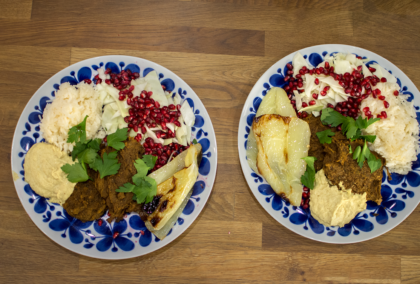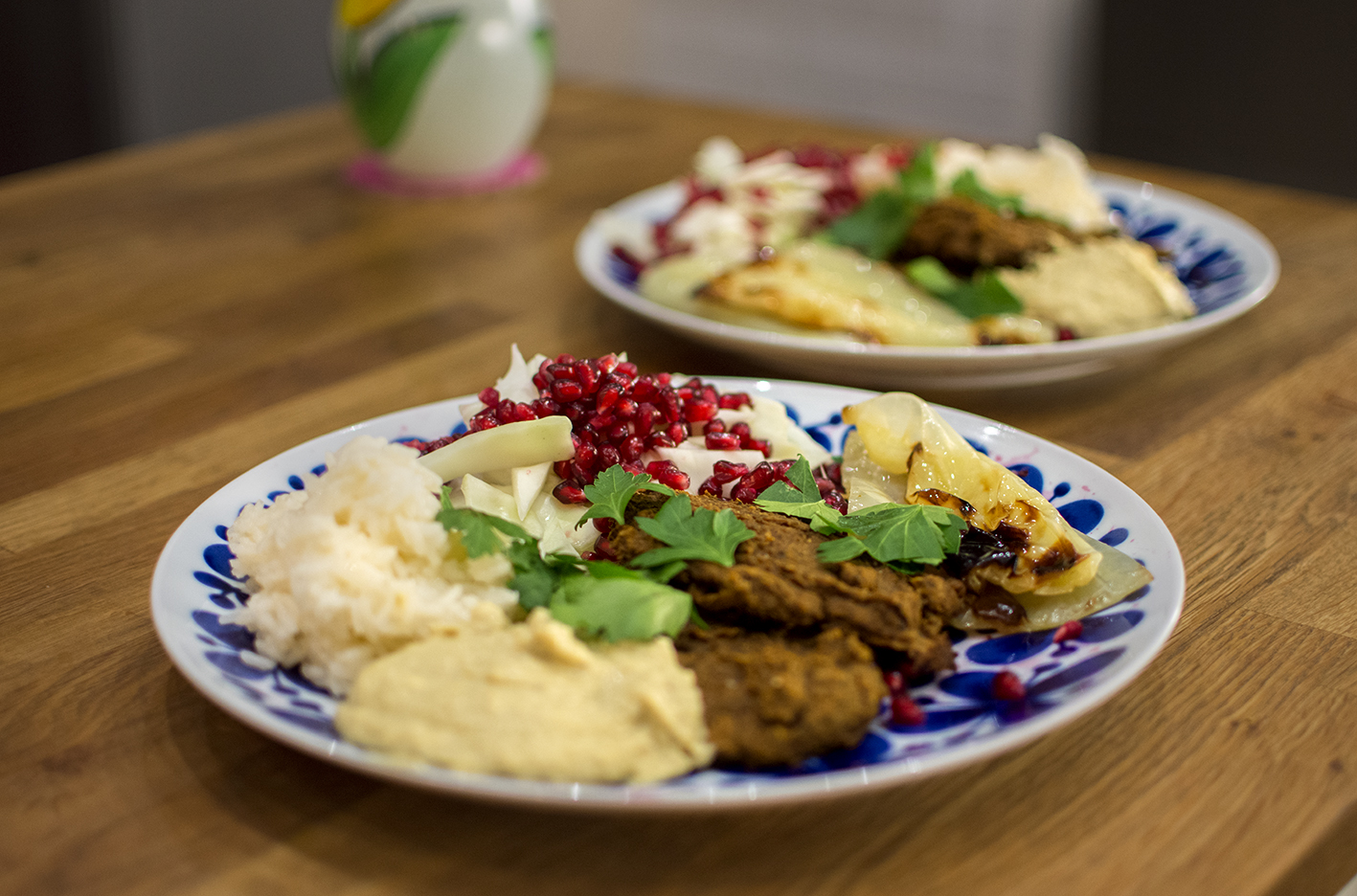 Servera bönbiffarna med hummus, ugnsbakad paprika, ris, strimlad vitkål. Strössla över granatäpplekärnor och garnera med persiljeblad.