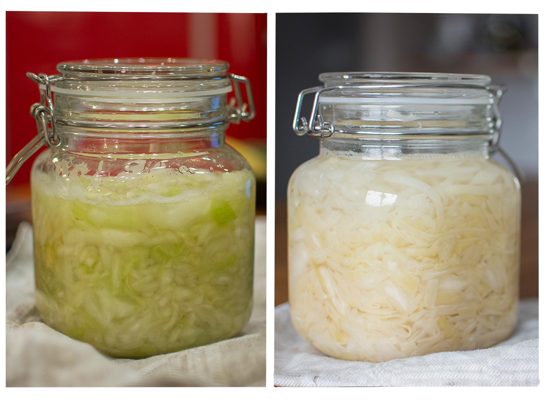 Tyckte inte att jag fick till någon riktig fermentering; att det helt enkelt inte hände så mycket med min kål under veckorna i burken. Men när jag tittar på fotot från dag ett och det jag tog nu så är det ju en helt annan färg och textur, mer grönt till vänster och vitt till höger. Bra med bildbevis!