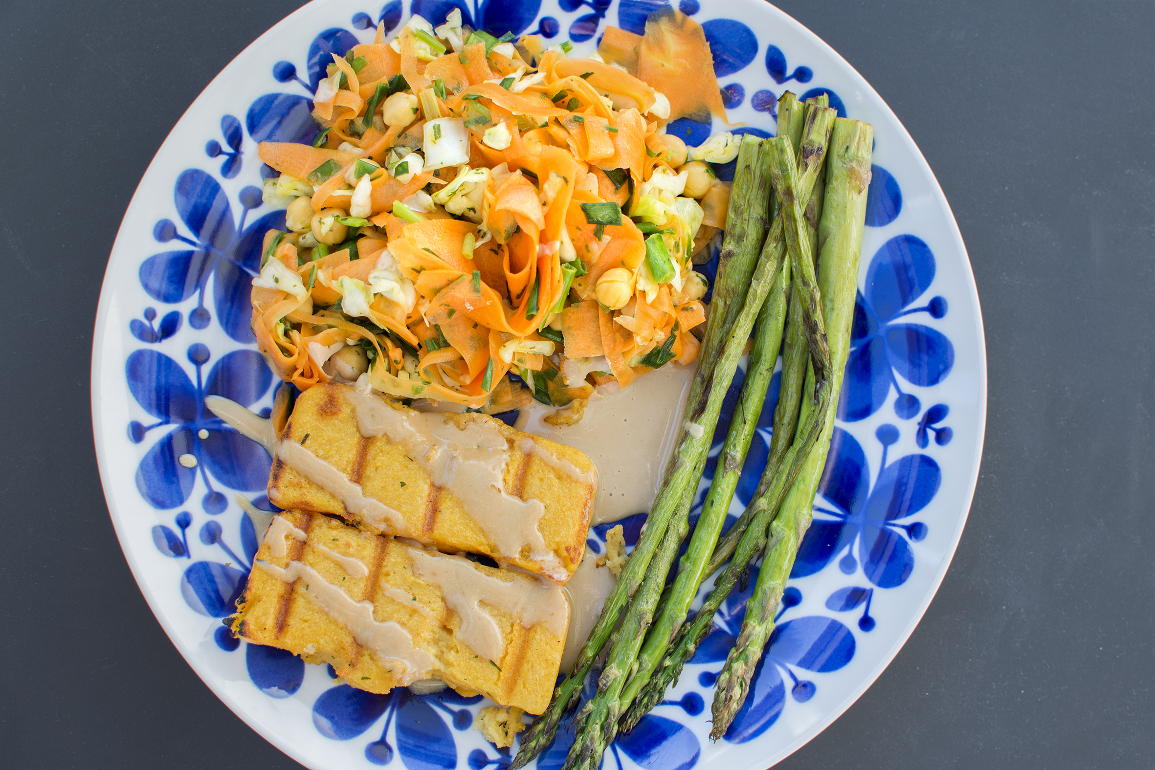 Servera med sallad och tahinidressing som du ringlar över polentan. Grilla eventuellt någon mer grönsak också. Jag körde med sparris för grillad sparris kan det aldrig bli för mycket av.